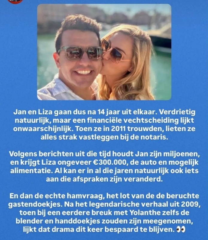 De scheiding van Jan Smit en zijn vrouw is momenteel een onderwerp waar veel over wordt gesproken in de media en op social media. Na ruim veertien jaar huwelijk lijkt er een einde te komen aan de relatie tussen de zanger en zijn partner Liza. Volgens berichten uit verschillende entertainmentkringen zou de verdeling van geld en bezittingen echter opvallend soepel verlopen. Waar eerdere relaties van de zanger voor de nodige commotie zorgden, lijkt hij dit keer goed voorbereid te zijn geweest.