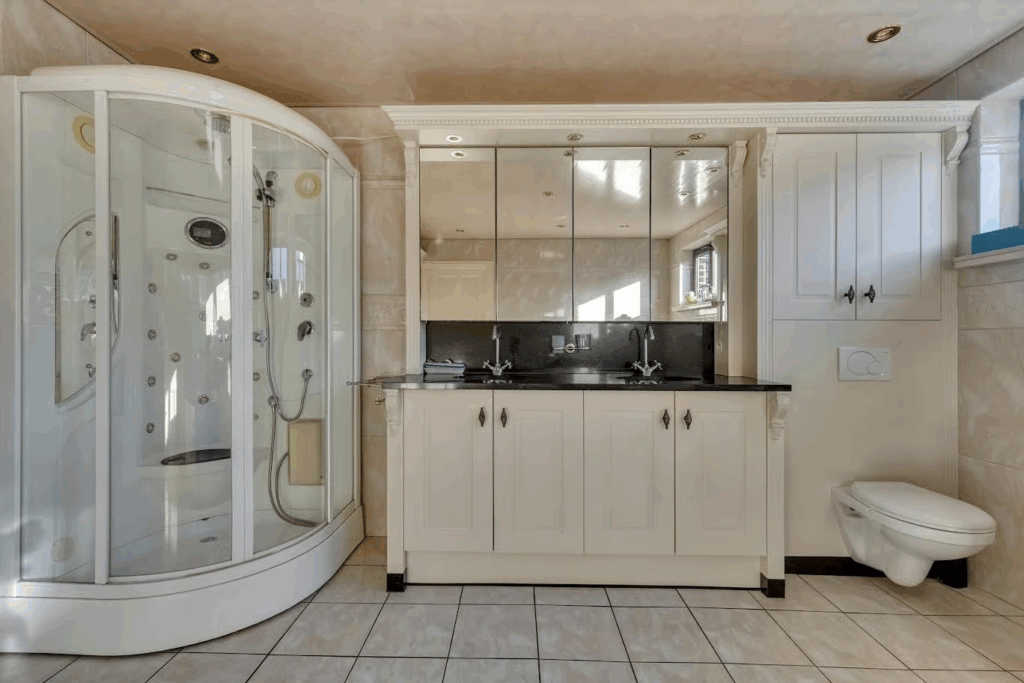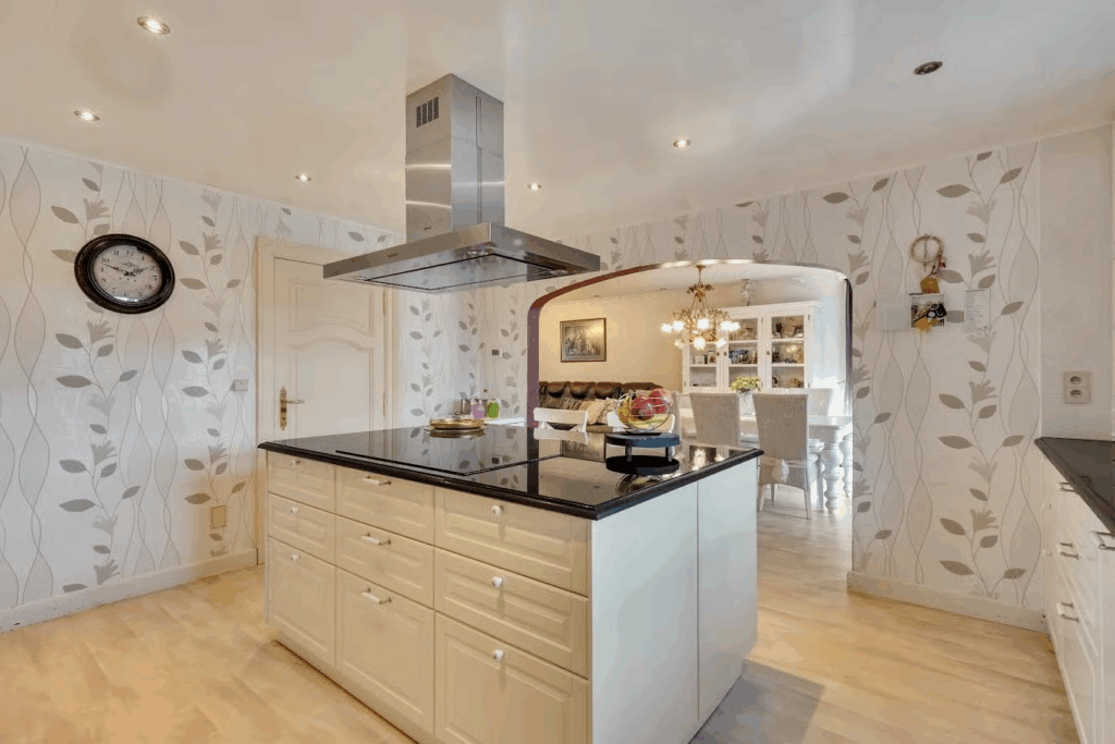 De open inbouwkeuken van 19 m² is volledig uitgerust met hoogwaardige toestellen, waaronder een inductiekookplaat, stoomoven, vaatwasser en granieten werkblad. Voor wie een huis in België kopen overweegt met oog voor comfort, is dit een groot pluspunt.