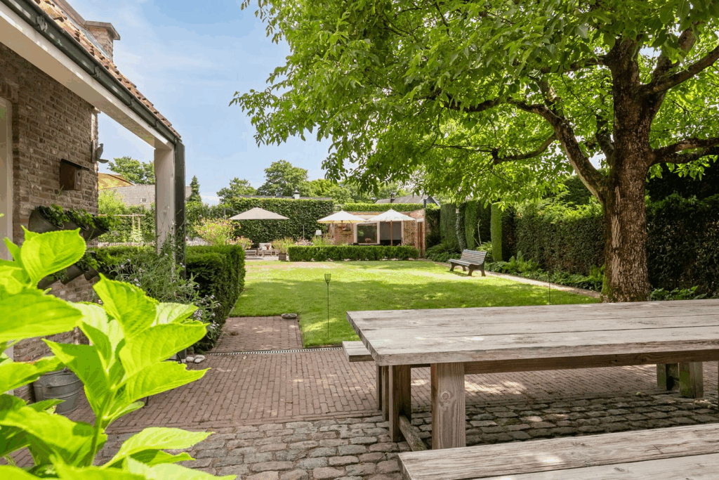 De groene tuin heeft meerdere terrassen, een veranda met Efteling-ontwerpdetails en een royaal zonneterras met uitzicht op een grote walnotenboom. Dankzij de beregeningsinstallatie en een diepe waterput is onderhoud eenvoudig.