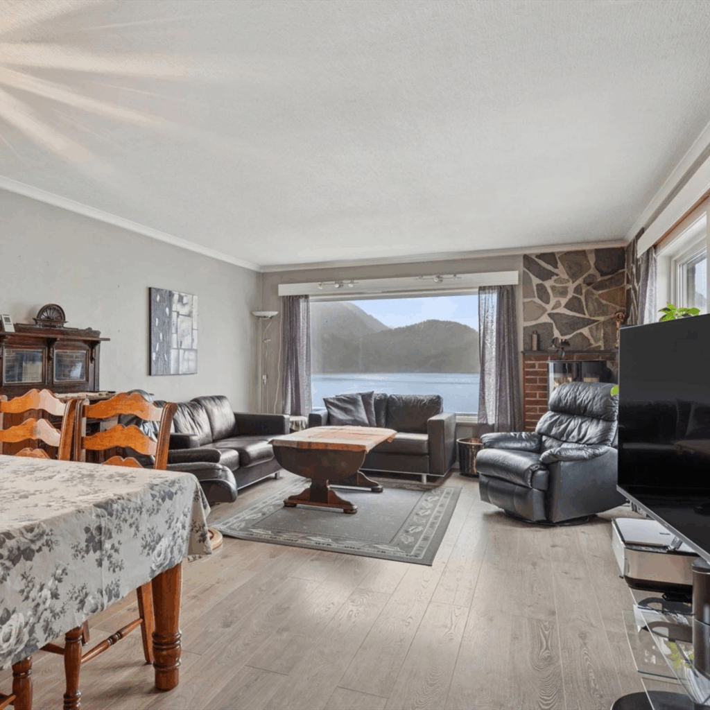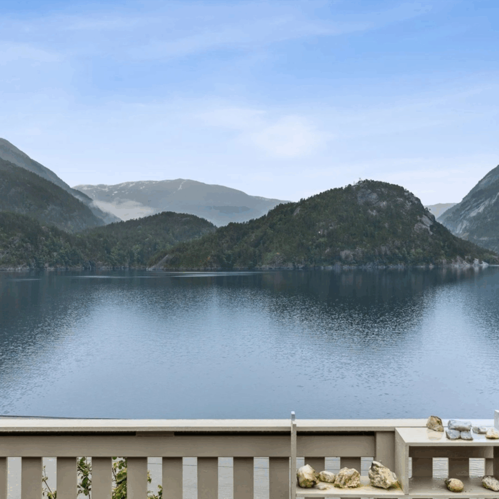Vanaf het houten terras kijk je direct uit over een glinsterend fjord, omlijst door groene bergen en heldere lucht. Hier hoef je niet op vakantie om tot rust te komen – je leeft er middenin. Het uitzicht verandert elk seizoen in een nieuw kunstwerk, waardoor het voelt alsof de natuur je elke dag een nieuw gedicht schenkt.