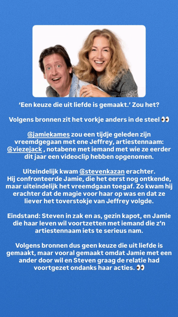 De kwestie rond Steven Kazan en Jamie laat zien hoe ingewikkeld het kan zijn om liefde en werk te combineren – vooral als het persoonlijke leven plotseling het publieke domein in wordt getrokken. Terwijl Steven zich herpakt en Jamie haar weg lijkt te vinden aan de zijde van Vieze Jack, kijken veel volgers met belangstelling toe hoe deze situatie zich verder ontwikkelt.
