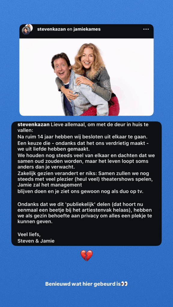 Het nieuws over Steven Kazan en Jamie heeft de showbizzwereld op zijn kop gezet. Na een relatie van meer dan veertien jaar hebben de twee bekendgemaakt dat hun huwelijk tot een einde is gekomen. Op Instagram deelde Steven het verdrietige bericht, waarbij hij aangaf dat de beslissing met wederzijds respect is genomen. Maar achter de schermen lijkt het verhaal over Steven Kazan en Jamie veel pikanter te zijn.