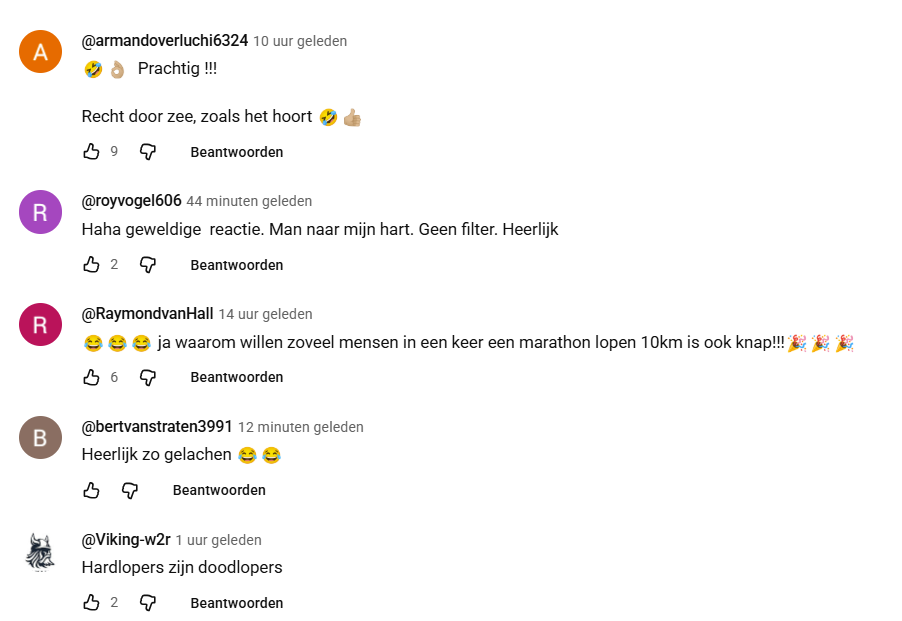 De kracht van dit fragment zit in de directheid. Geen glad verhaal achteraf, maar iemand die precies zegt wat hij voelt. De reacties online laten zien dat mensen dat waarderen. Sommigen vinden het hilarisch, anderen vooral herkenbaar. En juist daarom blijft dit moment uit de Marathon van Rotterdam hangen.