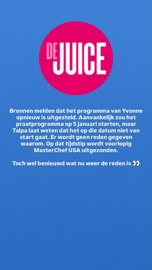 Aanvankelijk zou de Juiceshow van Yvonne Coldeweijer al dit najaar van start gaan. Die lanceerdatum kwam echter nooit op de buis, en nu is ook de tweede datum geschrapt. Net5 laat weten dat er “geen aanvullende informatie” wordt gegeven over het uitstel, behalve dat MasterChef USA voorlopig de plek overneemt. Officieel klinkt het zakelijk en inhoudsloos, maar insiders wijzen op problemen binnen het team. Het vertrek van eindredacteur Eric de Munck zorgt voor extra olie op het vuur. Hij bevestigde zelf dat hij “niet meer op dezelfde lijn zit als Yvonne”. In de juicewereld klinkt dat als diplomatie voor: dikke ruzie.