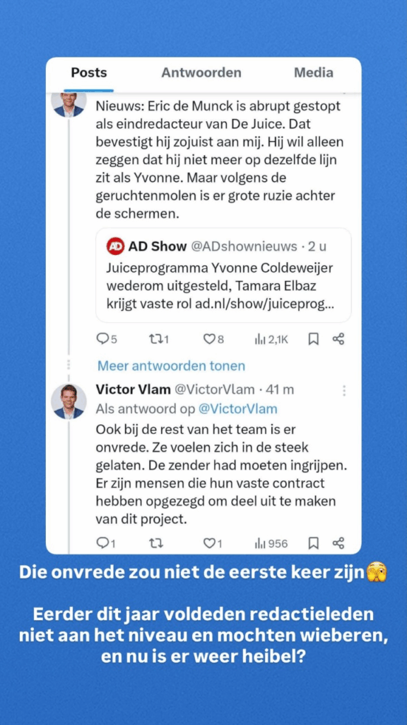 Met de interne spanningen, het vertrek van belangrijke teamleden en het zwijgen van de zender blijft de vraag hangen: komt de Juiceshow van Yvonne Coldeweijer er überhaupt nog in de vorm die eerst werd aangekondigd? Of is de chaos achter de schermen groter dan men wil toegeven?