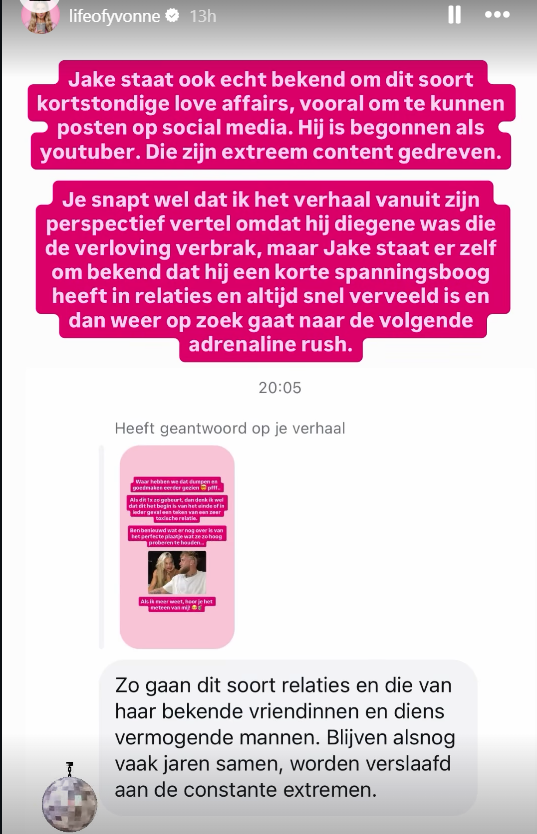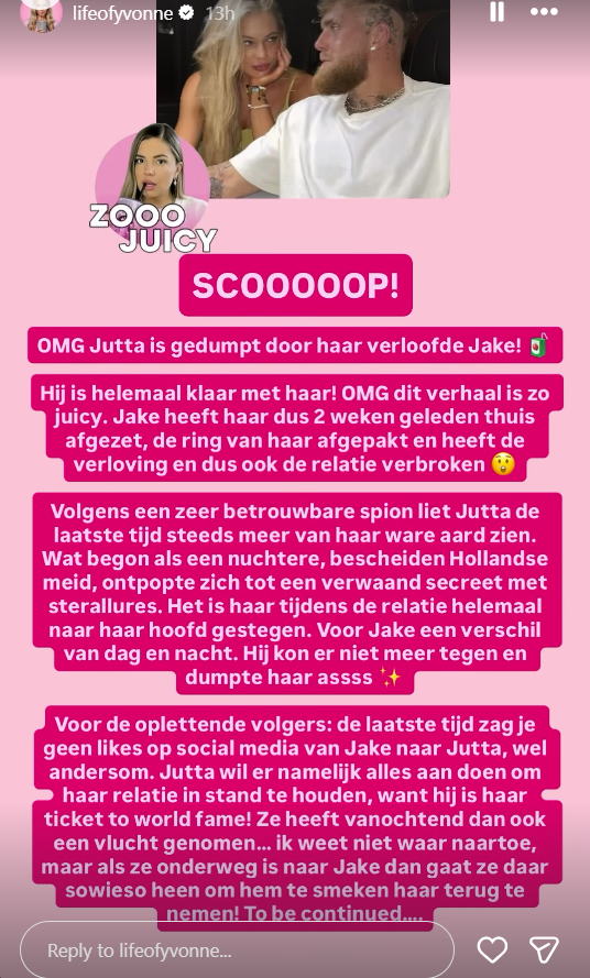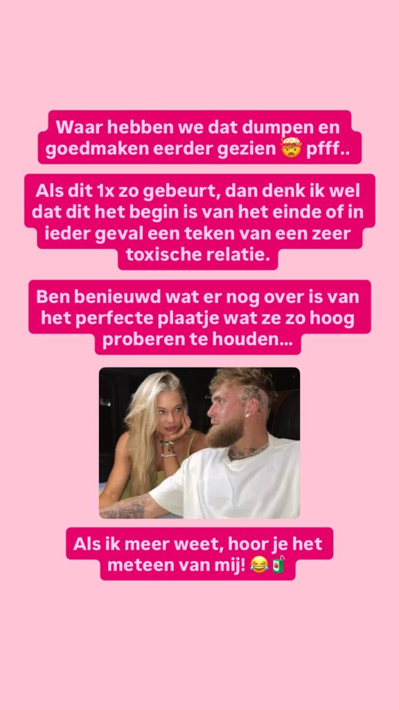 In verschillende stories en screenshots worden grote uitspraken gedaan over Jutta Leerdam en Jake Paul. Zo zou Jake haar hebben gedumpt, de verlovingsring hebben afgepakt en niet trouw zijn geweest tijdens de relatie. In één van die berichten valt zelfs de quote: “Hij is helemaal klaar met haar”.