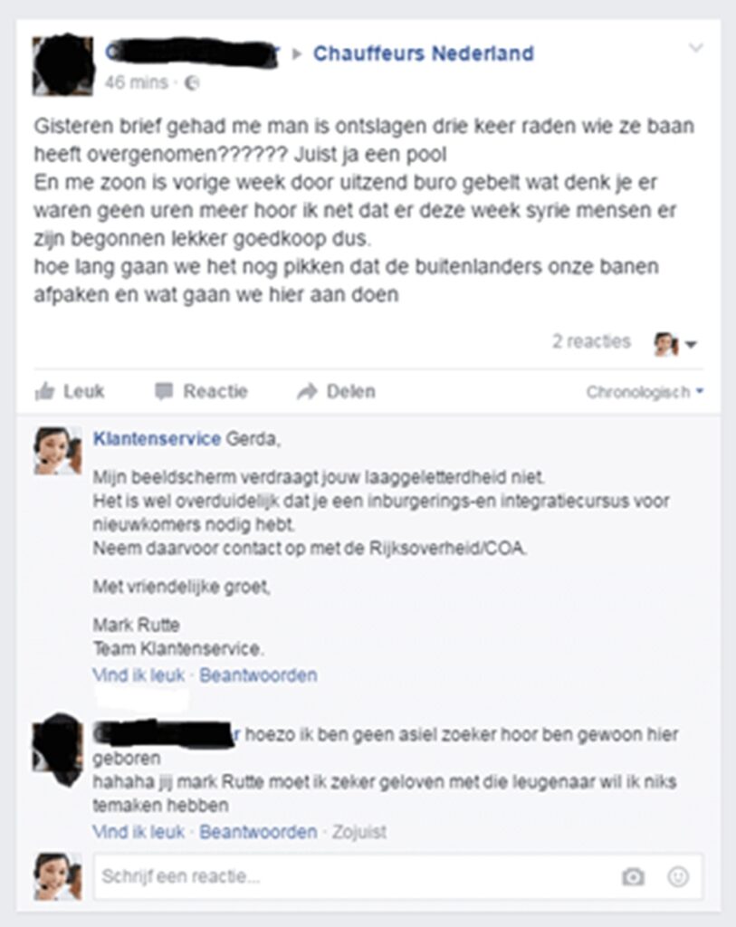 Het begon allemaal met Gerda’s emotioneel geladen post: “Gisteren brief gehad, me man is ontslagen, drie keer raden wie ze baan heeft overgenomen?????? Juist ja, een pool. En me zoon is vorige week door uitzendburo gebeld, wat denk je, er waren geen uren meer. Hoor ik net dat er deze week Syrische mensen zijn begonnen, lekker goedkoop dus. Hoe lang gaan we het nog pikken dat de buitenlanders onze banen afpakken en wat gaan we hieraan doen?”