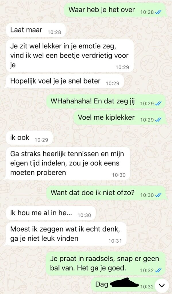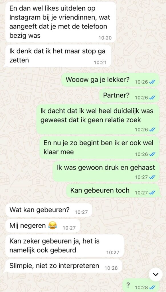 Wat begon als een rustige ochtendapp tussen twee volwassenen, eindigde in een emotionele storm. De man werd boos omdat zij hem aansprak op zijn gedrag. In plaats van verantwoordelijkheid te nemen, begon hij verwijten te maken en passief-agressieve opmerkingen te sturen. Hij klaagde dat ze hem “negeerde”, terwijl hij zelf degene was die zijn afspraken niet nakwam. Het gesprek ontaardde in een opeenstapeling van gekwetste trots, sarcasme en zelfs een sneer over haar uiterlijk — gedrag dat eerder bij een puber dan bij iemand van een datingapp voor hoog opgeleide past.