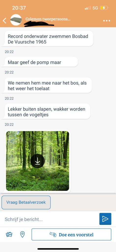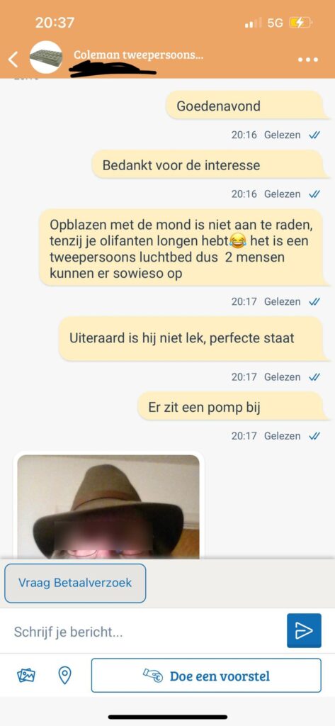 Het meest opmerkelijke was misschien nog wel dat er foto’s en losse opmerkingen tussendoor werden gestuurd. Hierdoor leek het gesprek steeds meer op een absurdistische chatshow. Uiteindelijk liep de deal spaak, maar de screenshots bewijzen één ding: een luchtbed op Marktplaats kopen of verkopen levert soms meer vermaak dan een avondje Netflix.