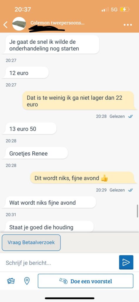 Maar daarna nam het gesprek een wending. De koper vond namelijk dat een pomp overbodig was, want “opblazen met de mond lukt ook wel, tenzij je olifantenlongen hebt 😂”. Wat begon als een grapje, groeide uit tot een discussie over de prijs. Terwijl de verkoper netjes €22 vroeg, ging de koper steeds lager en lager in zijn biedingen. Het luchtbed op Marktplaats veranderde zo van een simpele deal in een soort komisch toneelstuk. Ieder bericht werd vreemder.