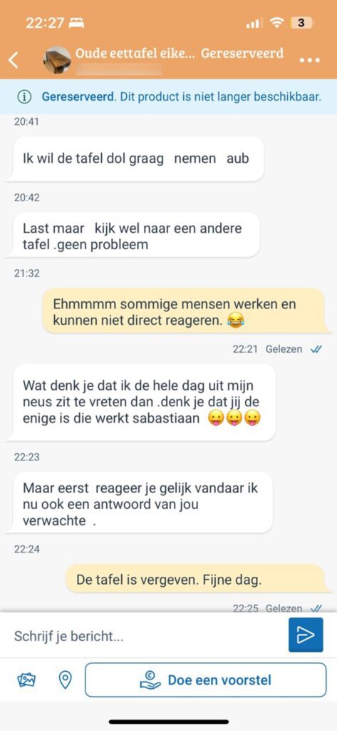 Rond 22:20 uur besloot de verkoper duidelijkheid te geven: de tafel was inmiddels aan iemand anders beloofd. Dat viel totaal verkeerd bij de geïnteresseerde koper. Wat begon met lichte irritatie, mondde al snel uit in grove beledigingen. De verkoper werd uitgescholden en er werd zelfs gedreigd om de situatie bij Marktplaats te melden.