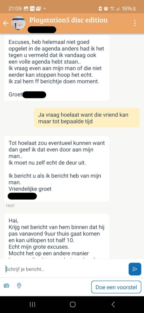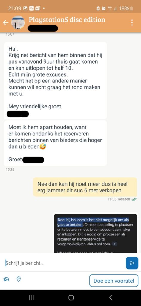 De koper houdt het hoofd koel en blijft duidelijke vragen stellen. Hij stelt voor om het apparaat te komen bekijken, wil bevestiging van de werking, en blijft aandringen op transparantie. Ondanks herhaalde pogingen van de verkoper om vertrouwen te winnen – inclusief vaagheden over postcodes en het “reserveren” van het apparaat – lijkt de oplichter uiteindelijk door de mand te vallen. Zeker als blijkt dat meerdere bieders ineens geïnteresseerd zouden zijn, zonder enige bewijslast. De hele conversatie is een leerboekvoorbeeld van hoe iemand probeert een gestolen Playstation aan de man te brengen via valse informatie en slinkse communicatie.