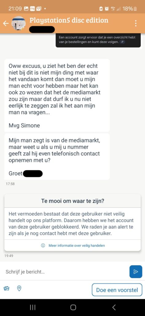 Opvallend is hoe de verkoper zich steeds meer in de nesten werkt. Ze beweert dat de Playstation van haar man en zoontje is en dat ze “geen verstand” heeft van dit soort zaken. Als de koper blijft aandringen op de aankoopbon, verandert het verhaal ineens: het apparaat zou als gast besteld zijn bij Bol.com, waardoor er geen officieel bewijs van aankoop is. Een duidelijke rode vlag wanneer het gaat om een product met hoge waarde. Deze onduidelijkheden wijzen sterk in de richting van een gestolen Playstation.