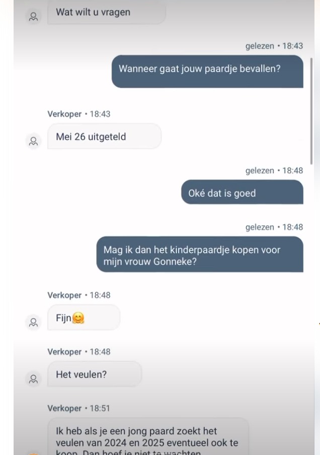 De geïnteresseerde koper begint nog vrij normaal met de vraag wanneer het zwanger paard moet bevallen. De verkoper antwoordt netjes: 26 mei is de merrie uitgeteld. Tot zover niets bijzonders.
