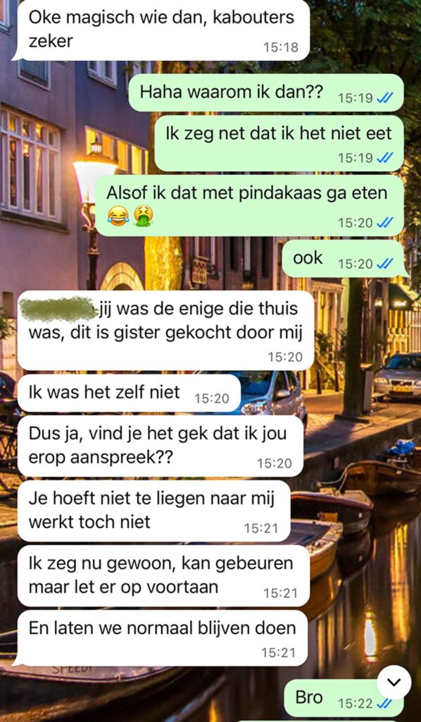 Het begon met een ogenschijnlijk klein incident in een gedeelde keuken: een huisgenoot trof zijn vers gekochte zuivelspread “verpest” aan door vermoedelijk een pindakaasbesmeurd mes. Wat volgde, was een kettingreactie van beschuldigingen, ontkenningen en zelfs een flinke portie zelfmedelijden — allemaal via een reeks felle chatberichten. De sfeer in huis sloeg om van gezellig naar gespannen in een paar minuten.