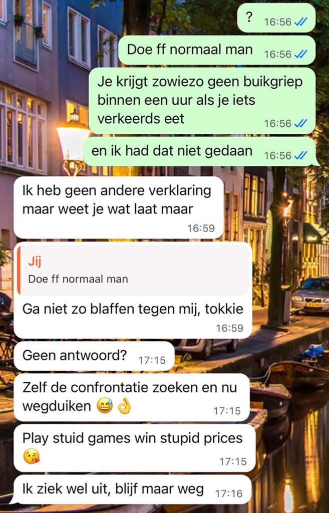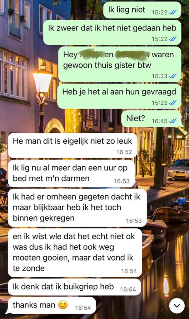 De beschuldigde huisgenoot hield vol onschuldig te zijn, maar dat hield de klager niet tegen om zijn buikklachten volledig te wijten aan het eten van de besmette spread. Hij gaf toe dat hij het product had moeten weggooien, maar dat zonde vond. Met uitspraken als “Ik lig al een uur op bed met m’n darmen” en “Ik denk dat ik buikgriep heb”, probeerde hij zijn gelijk te halen — tot frustratie van de ander.