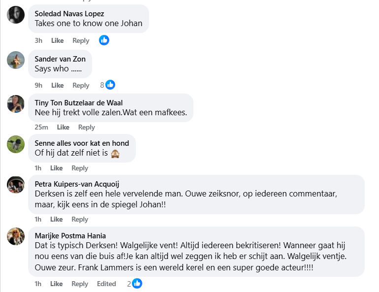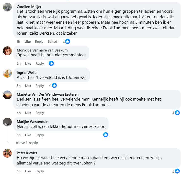 Een reactie die veel wordt gedeeld luidt: “Derksen is zelf een hele vervelende man. Ouwe zeiksnor, op iedereen commentaar, maar kijk eens in de spiegel Johan!!” Anderen sluiten zich daarbij aan en vinden dat hij in bijna elke uitzending iemand afkraakt.