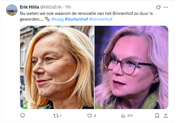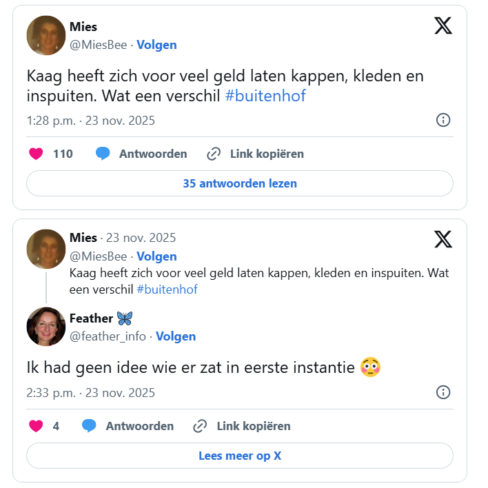 Afgelopen weekend zorgde een tv-optreden met Sigrid Kaag bij het programma Buitenhof voor veel reacties op sociale media. Kijkers vergeleken recente studiobeelden met oudere foto’s en merkten op dat het uiterlijk van de oud-politica anders leek dan voorheen. Op X (voorheen Twitter) verschenen berichten waarin mensen spraken van een “totaal ander gezicht” en zelfs suggereerden dat er cosmetische ingrepen hadden plaatsgevonden.