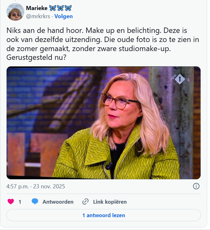 De ophef rond Sigrid Kaag draait vooral om de vergelijking tussen een oudere spontane foto en een recent studiobeeld. Waar sommigen spreken van een drastische verandering, wijzen anderen op logische verklaringen zoals make-up, belichting en professionele presentatie. Het artikel waarop deze reacties zijn gebaseerd benadrukt dat er geen bewijs is voor cosmetische ingrepen en dat het vooral gaat om interpretaties van kijkers. Ondertussen bleef haar inhoudelijke kritiek op de media en het politieke klimaat een belangrijk, maar minder besproken onderdeel van het tv-optreden.