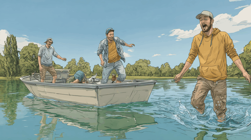 Weer een half uur later en de blikjes zijn weer leeg. Sjoerd, licht aangeschoten en vol vertrouwen, denkt: als zij het kunnen, dan ik ook. Hij stapt over de rand van de boot…