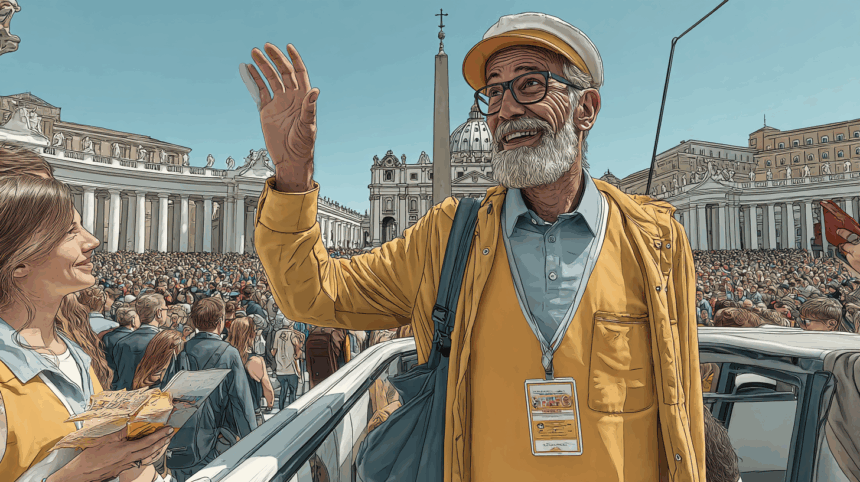 De filiaalmanager moet nog harder lachen, maar Keesje loopt naar binnen… en jawel, een paar minuten later verschijnt hij stralend naast de paus, zwaaiend naar het publiek.
