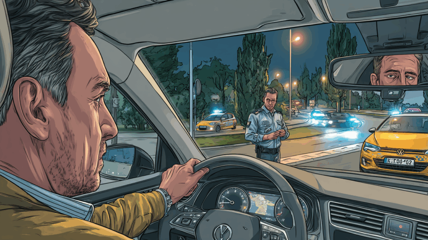 Hij heeft iets te veel gedronken, dus hij rijdt supervoorzichtig om geen politie op te laten vallen.