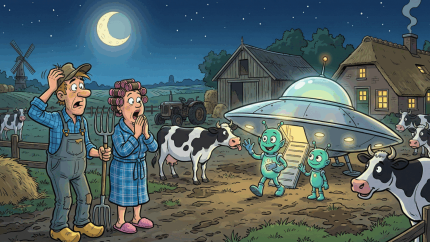 Op het erf zien ze het ongelooflijke: een vliegende schotel is geland, midden tussen de koeien. De deur van het ding schuift open en er stappen twee aliens uit.