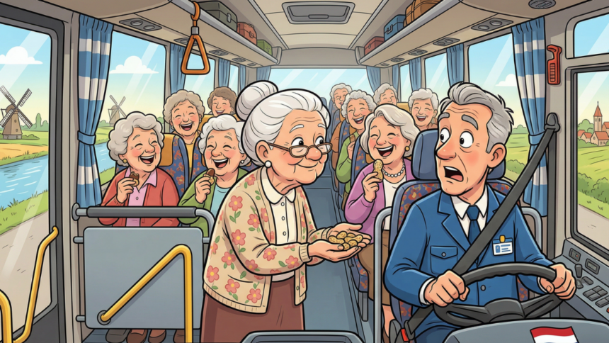 Een buschauffeur is met een touringcar vol oudere dames onderweg naar een dagtrip. Na een kwartiertje voelt hij ineens een tikje op zijn schouder. Als hij omkijkt, staat er een lieve oudere dame achter hem met een handje pinda’s.