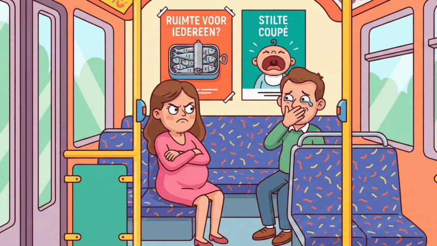Een man zat achterin een Nederlandse stadsbus toen er een hoogzwangere vrouw instapte.