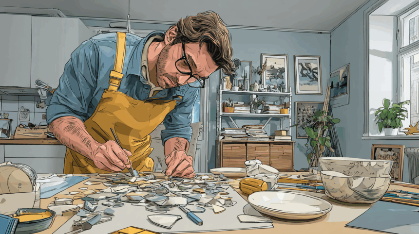 Hij pakt de kapotte borden van de CEO en de kinderspullen van de professor, lijmt alles op één doek en verkoopt het voor één miljoen euro.
