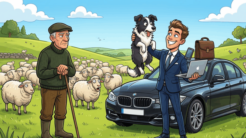 Een herder staat op een afgelegen veld rustig op zijn schapen te letten, wanneer er plots een glimmende BMW door het stof komt aanrijden. Uit de auto stapt een jonge kerel, strak in pak, dure zonnebril op, blinkende schoenen, helemaal het type dat zichzelf nogal interessant vindt.