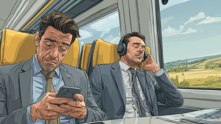 Hij appt collega’s. Googelt met trage trein-wifi.