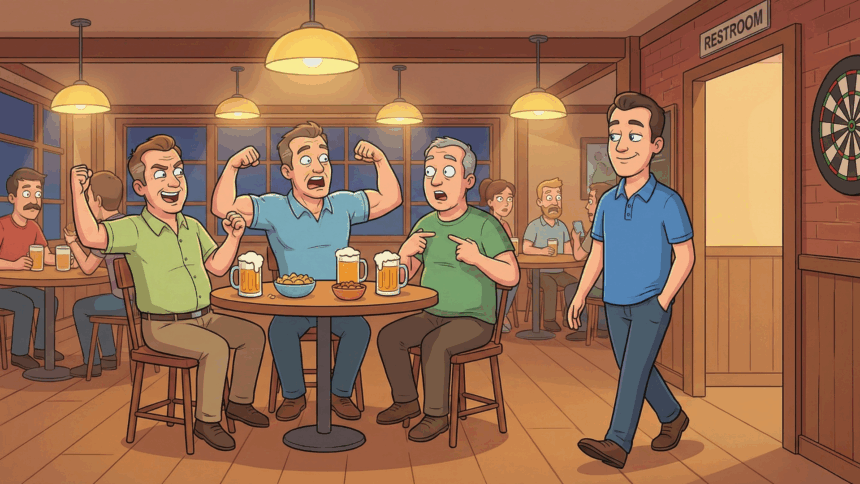 Vier oude vrienden zien elkaar na dertig jaar weer op een reünie. Na een paar drankjes gaat één van hen even naar het toilet.