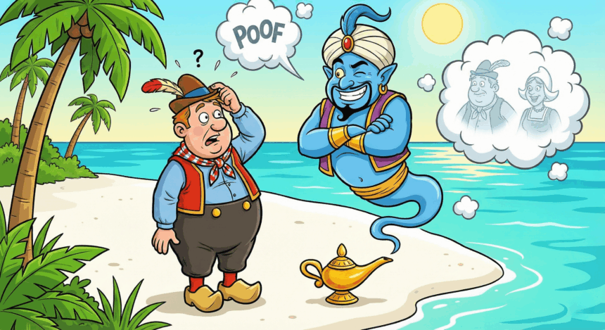 Drie vrienden stranden na een mislukte zeiltocht op een onbewoond eiland ergens ver van huis. Na dagen kokosnoten eten vinden ze ineens een oude lamp in het zand. Ze wrijven eraan en poef — er verschijnt een geest.