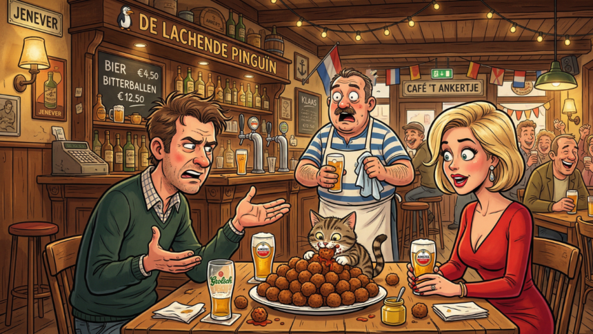Hij bestelt een biertje, een wijntje voor de vrouw en 8 gehaktballen voor de poes.