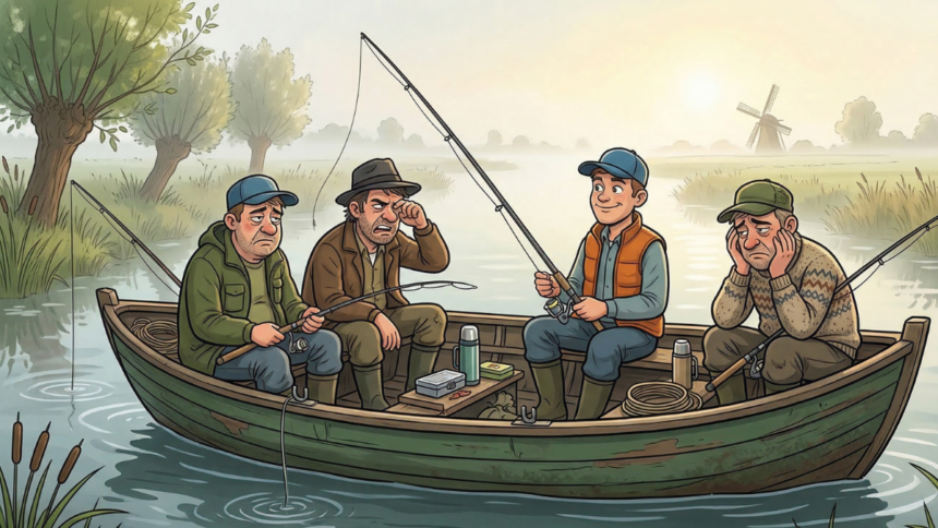 Vier getrouwde mannen zitten op zaterdagochtend vroeg in een boot te vissen.