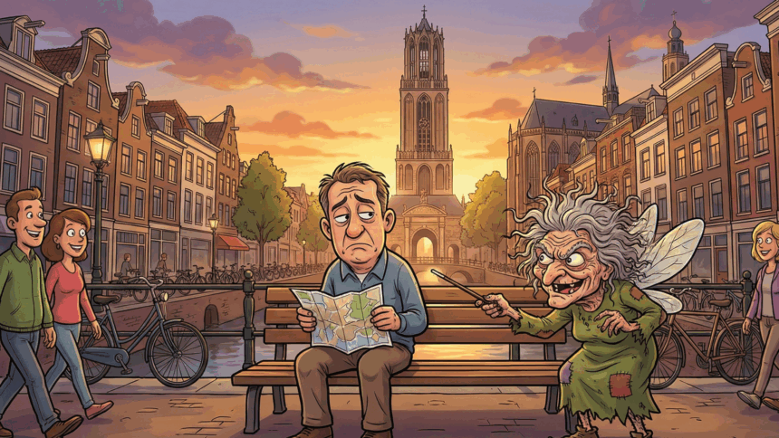 Op een avond zit hij moedeloos op een bankje op de Neude in Utrecht, starend naar de Domtoren.