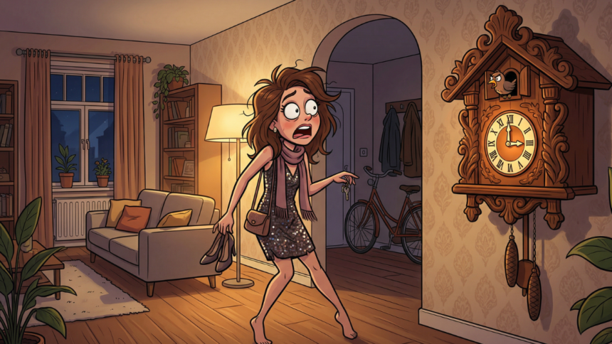 Toen ze voorzichtig de voordeur opende, hoorde ze meteen de koekoeksklok in de gang: