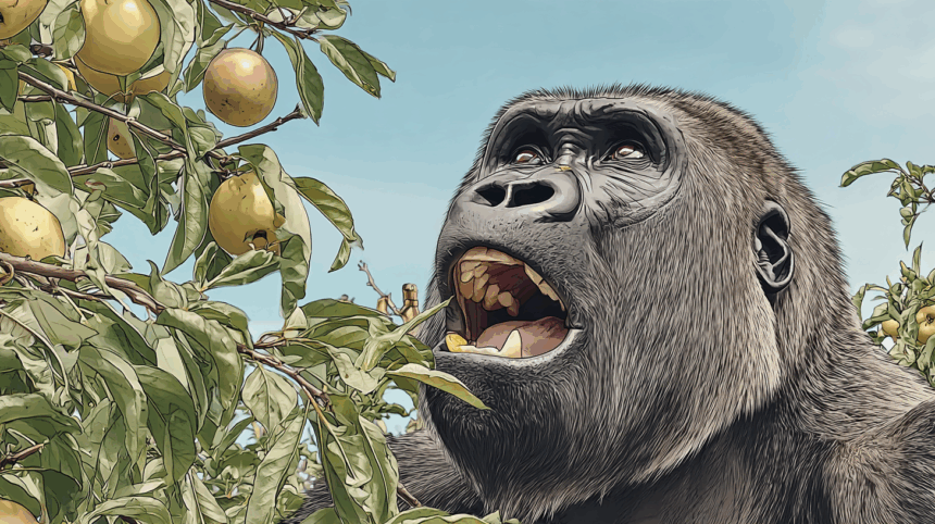 Thuis aangekomen zag Rick het meteen: een enorme gorilla zat brullend in de appelboom en mikte alweer met een Elstar. Hij dook snel naar binnen.