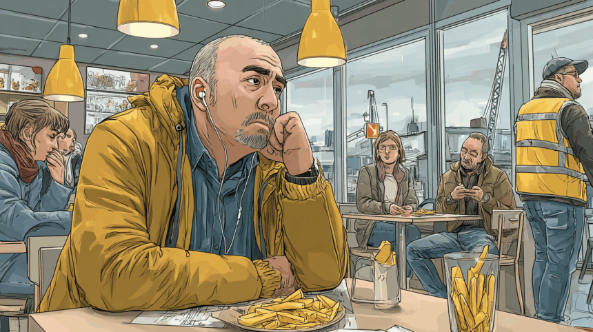 Twee bouwvakkers bij het raam, een moeder met haar kind achterin, en de snackbarhouder druk bezig bij de frituur.