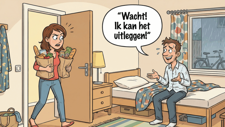 Ze loopt de slaapkamer binnen… en daar ligt haar man in bed met een jonge vrouw.