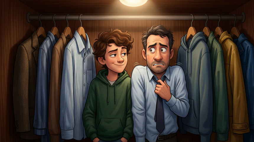 Een vrouw heeft overdag een minnaar terwijl haar man aan het werk is. Op een dag zit haar 9-jarige zoontje stiekem in de kast in de slaapkamer. Plots komt de man onverwacht thuis en de vrouw duwt snel haar minnaar óók in de kast… samen met het joch.