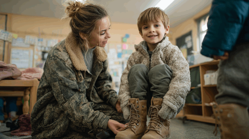 In de kleuterklas helpt juf Emma kleine Bram met zijn winterlaarsjes.
