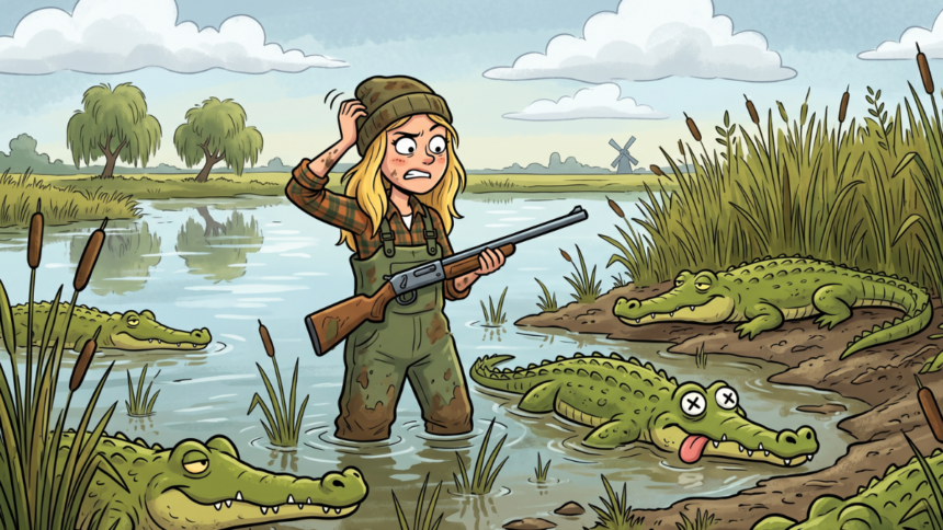 BAM! Ze schiet het beest neer en sleept het met veel moeite op het droge. Daar liggen al meerdere dode krokodillen.