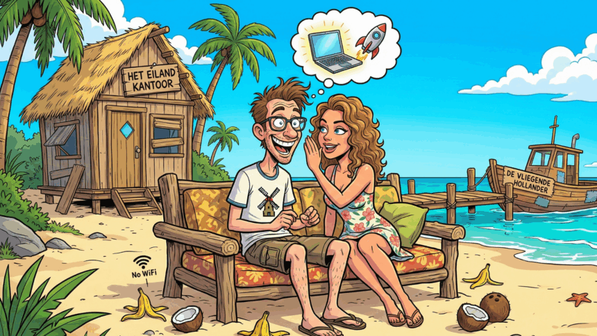 Na uren dobberen spoelde hij aan op een onbewoond eiland. Geen andere overlevenden. Geen wifi. Geen bereik. Alleen bananenbomen en kokosnoten.