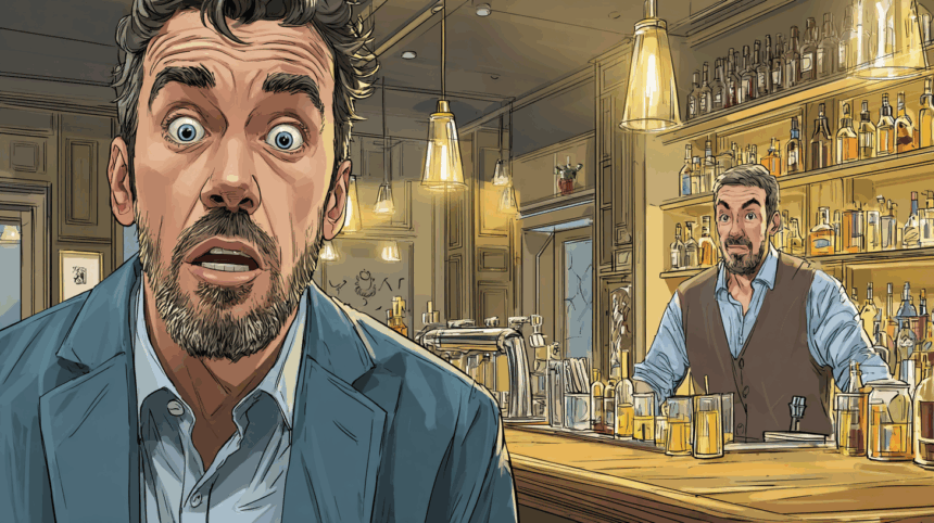 Een man die al de hele avond aan het feesten is, zit aan de bar en bestelt nog een biertje.