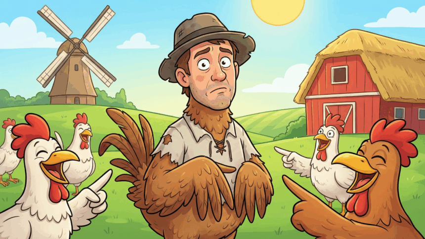 “Rustig maar,” zegt de haan. “Je gaat gewoon een ei leggen. Heel normaal.”