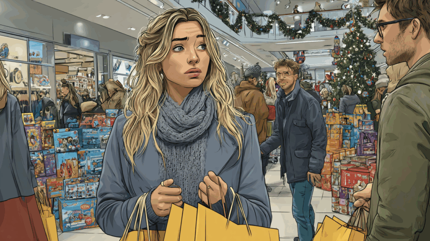 Een man en zijn vrouw waren vlak voor kerst samen aan het winkelen. Na een tijdje merkt de vrouw dat haar man ineens verdwenen is. Omdat ze nog een hele lijst met dingen moesten kopen, belt ze hem snel op.