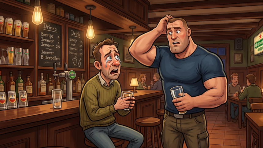 “Rustig maar,” zegt die brede gast, “ik haal wel een nieuw biertje voor je.”