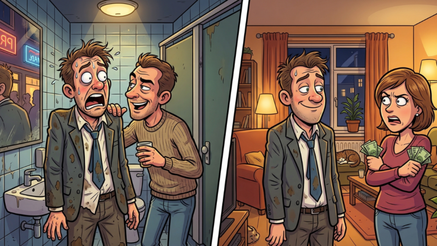 Hij stopt 50 euro in z’n zak, gaat terug naar de bar en drinkt er nog een paar. Later die avond komt hij thuis, straalbezopen.